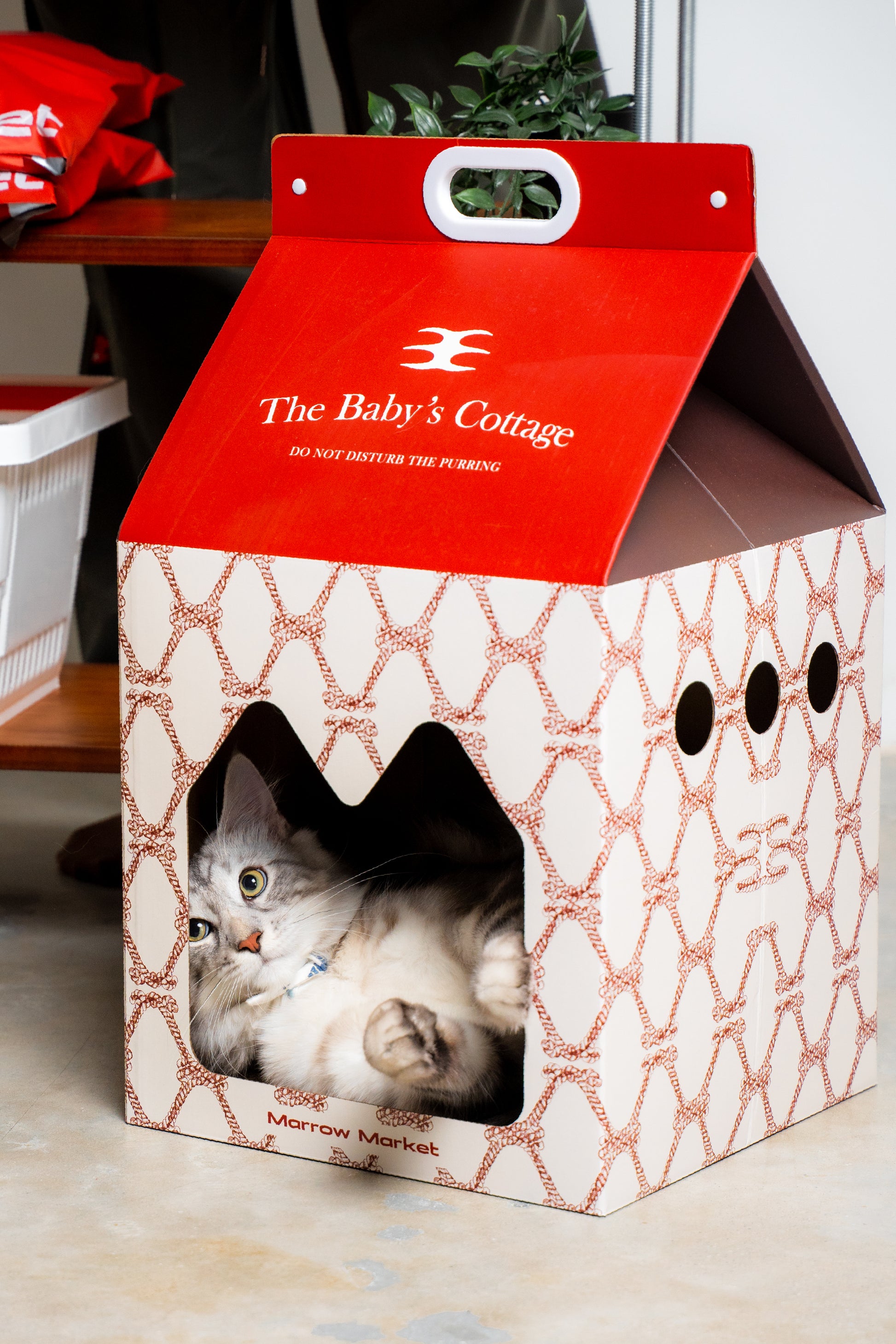 A cozy, foldable paper house designed in our signature brand prints – featuring a built-in scratching board and little peep- hole cut-outs.