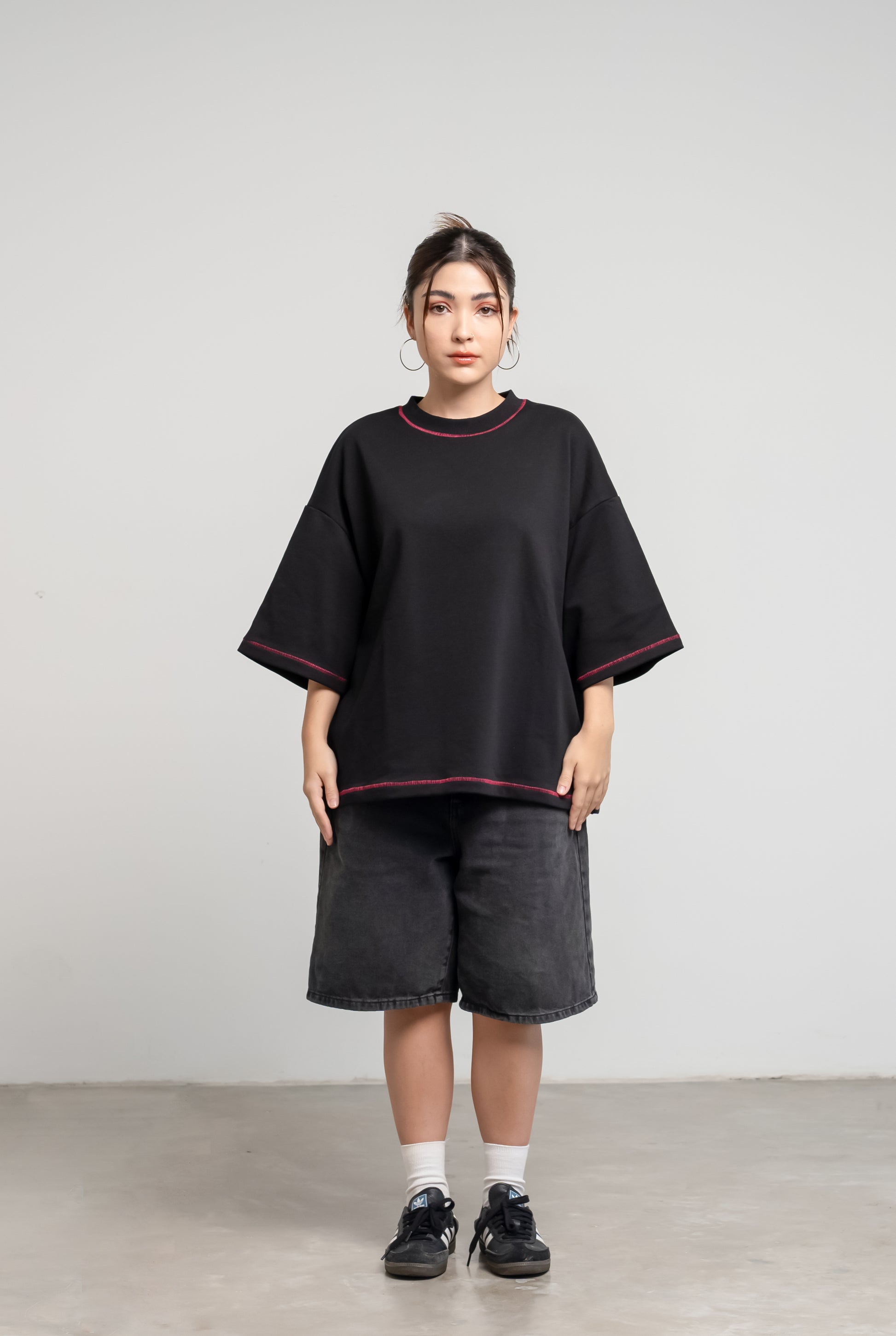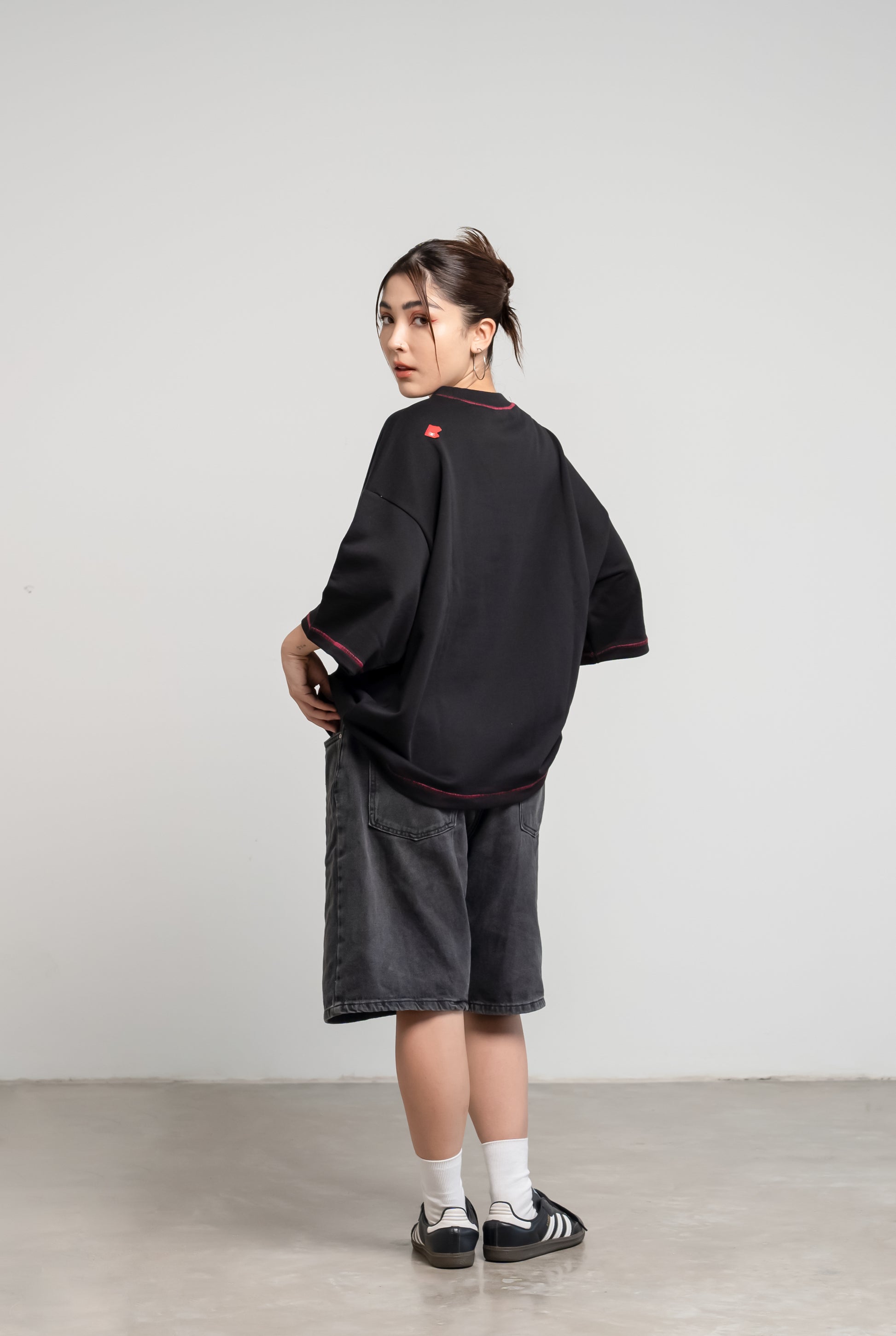 An oversized half-sleeve tee – featuring a flying sewn ribcage tag and red embroidery by the hem, sleeves, and collar.